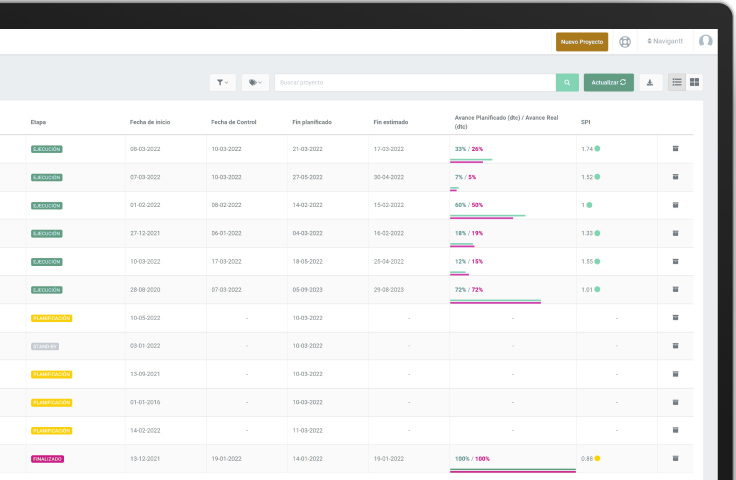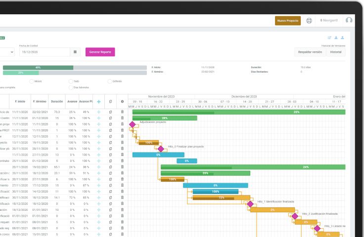 Crea cartas Gantt, controla los avances, genera reportes y colabora con tu equipo para tomar mejores decisiones.