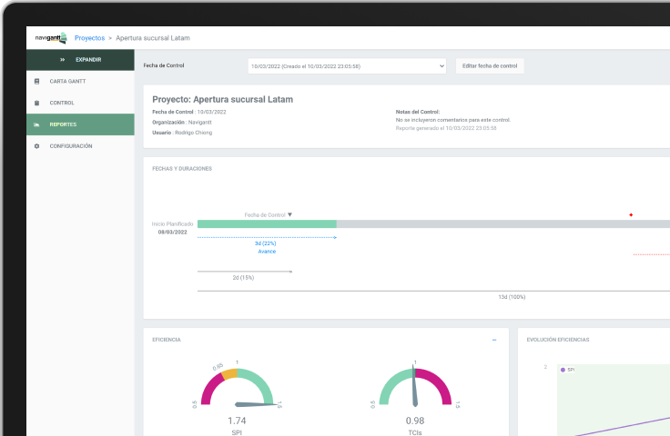 Recibe reportes de tiempos de ejecución y cálculos de indicadores de performance. Proyecta la fecha de término de tus proyectos en función de los rendimientos pasados. Observa la evolución de tu proyecto a medida que acumulas fechas de control.
